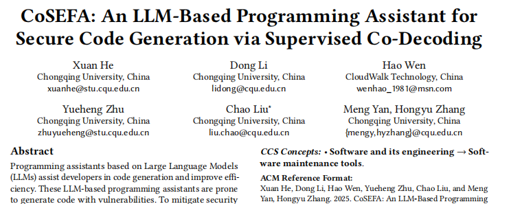 近日,云從科技與重慶大學大數(shù)據(jù)與軟件學院聯(lián)合研發(fā)的編程智能體——CoSEFA(Code SEcurity and Fix Agent)被軟件工程領(lǐng)域頂尖會議ACM SIGSOFT軟件工程基礎(chǔ)國際會議(FSE 2025)正式錄用。