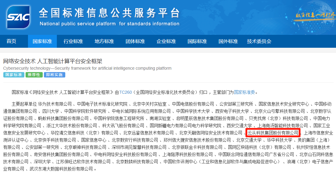 近日,國家標準GB/T 45958-2025《網(wǎng)絡安全技術(shù) 人工智能計算平臺安全框架》正式發(fā)布。該標準由全國網(wǎng)絡安全標準化技術(shù)委員會歸口管理,華為技術(shù)有限公司牽頭,云從科技作為核心起草單位之一,深度參與了標準制定工作。 這項將于2026年2月1日正式實施的國家標準,為人工智能計算平臺建立了系統(tǒng)化的安全框架,規(guī)定了安全功能、安全管理和角色安全職責,將有效應對硬件漏洞、訓練數(shù)據(jù)泄露、對抗樣本攻擊等新型安全威脅。